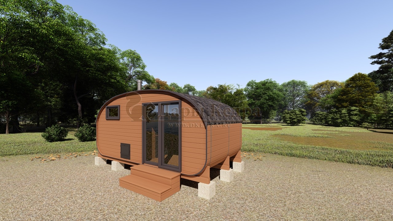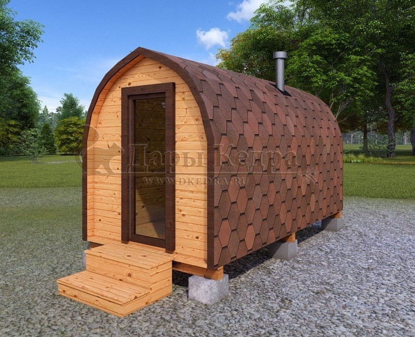 Симбиоз круглой и квадратной бани-бочки. Разработано с учётом эргономики, в ней так же просторно, как и в квадро-бочке, но при этом полукруглая крыша не дает задерживаться снегу и влаге на кровле. А еще такая баня безусловно красивая, мобильная и доступная каждому!