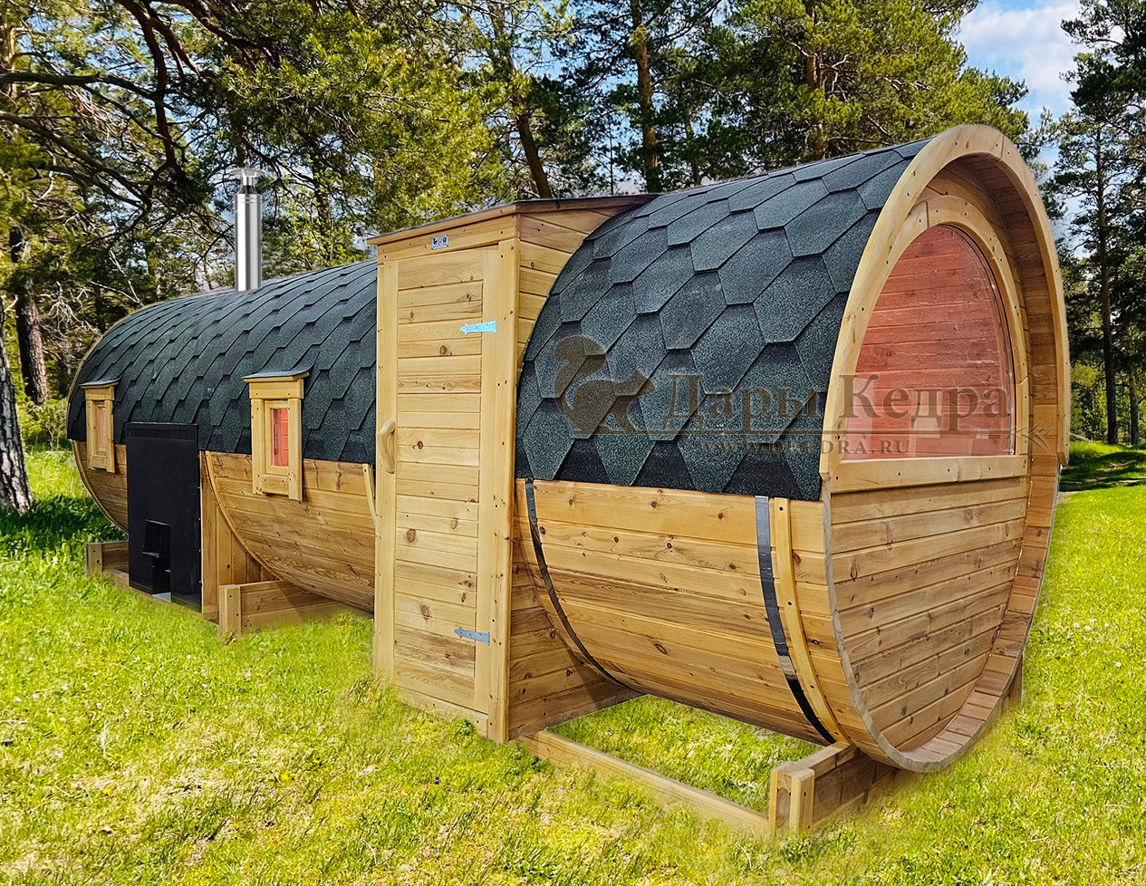 Баня-бочка круглая из кедра 2 метра Это изделие круглой вытянутой формы с одним парильным отделением. Внутреннее пространство включает в себя печь у дальней стены и лавки из кедра по обе стороны бани. За счет компактной формы баня нагревается в течение 30 минут. По вашему желанию ее можно укомплектовать козырьком, верандой и печью с внешней загрузкой, благодаря которой весь мусор после топки остается на улице. Круглая баня-бочка не требует полноценный фундамент, поэтому при необходимости ее можно перенести в другое место. Обращаем Ваше внимание, что в стандартную комплектацию бани входят лавки в парной с обеих сторон. Дополнительно можно заказать полок открытого или закрытого типа! Кедр обладает ароматическими свойствами. Он не деформируется и влагоустойчив, при правильном уходе за деревом на нем не развиваются грибки и плесень.