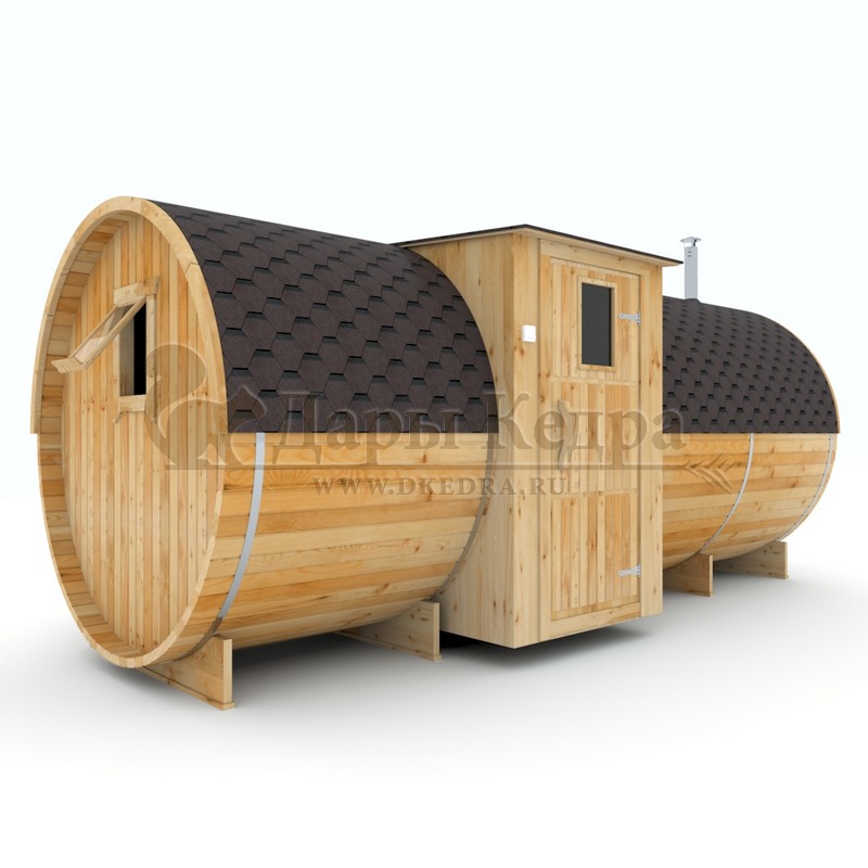 Баня-бочка круглая из кедра с верандой (все размеры) Это изделие круглой вытянутой формы. На веранде можно оставить вещи или отдохнуть после процедур парения. Лавочки из кедра находятся по всей длине бани-бочки с обеих сторон. Печь расположена в парилке около дальней стены. Время растопки такой печи не превышает 30 минут. В зависимости от выбранного размера круглая баня-бочка с козырьком имеет следующую комплектацию: Круглая баня-бочка 2,5 метра - парилка; Круглая баня-бочка 3,5 и 4,5 метра - раздевалка, парилка; Круглая баня-бочка 5,5 метров - раздевалка, парилка, моечная. По вашему желанию ее можно укомплектовать печью с внешней загрузкой, благодаря которой весь мусор вовремя топки остается на улице. Круглая баня-бочка не требует полноценный фундамент, поэтому при необходимости ее можно перенести в другое место. Обращаем Ваше внимание, что в стандартную комплектацию бани входят лавки в парной с обеих сторон. Дополнительно можно заказать полок открытого или закрытого типа! Кедр обладает ароматическими свойствами. Он не деформируется и влагоустойчив, при правильном уходе за деревом на нем не развиваются грибки и плесень.
