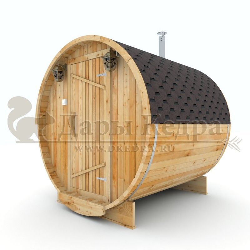 Баня-бочка круглая из кедра с боковым входом (все размеры) Боковой вход у такой модели находится в начале или в середине конструкции. В увеличенные модели можно повесить полочки и вешалки из кедра. Время растопки такой бани не превышает 30 минут. По вашему желанию баню-бочку можно дополнить печью с внешней загрузкой, благодаря которой весь мусор после топки останется на улице. Круглая баня-бочка не требует полноценный фундамент, поэтому при необходимости ее можно перенести в другое место. Обращаем Ваше внимание, что в стандартную комплектацию бани входят лавки в парной с обеих сторон. Дополнительно можно заказать полок открытого или закрытого типа! Кедр обладает ароматическими свойствами. Он не деформируется и влагоустойчив, при правильном уходе за деревом на нем не развиваются грибки и плесень.