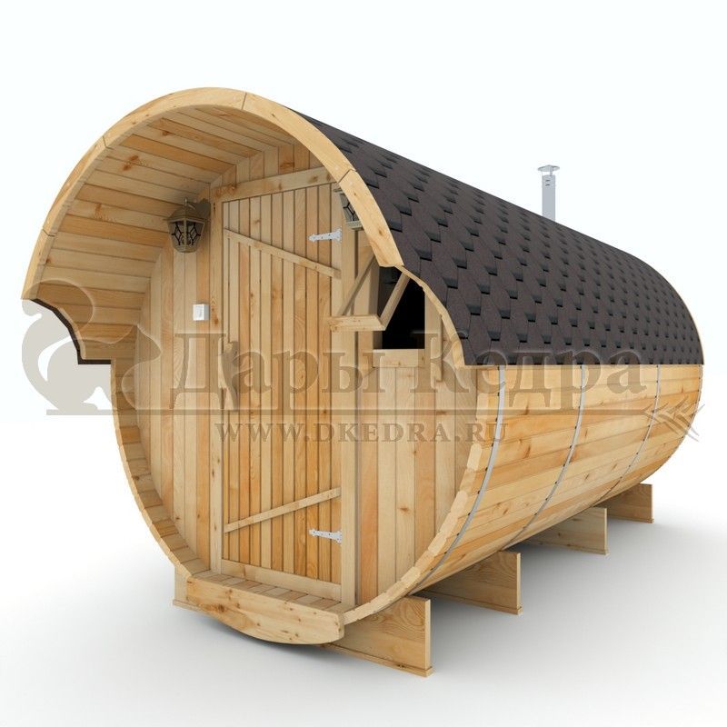 Баня-бочка круглая из кедра 4 метра Это изделие круглой вытянутой формы с двумя отделениями: раздевалкой и парной. Лавочки из кедра находятся по всей длине бани-бочки с обеих сторон. Печь расположена в парилке около дальней стены. Для удобства пользования в раздевалке установлена вешалка и полочка из кедра. За счет небольшой конструкции баня нагревается не более 30 минут. По вашему желанию баню-бочку можно дополнить печью с внешней загрузкой, благодаря которой весь мусор после топки останется на улице. Круглая баня-бочка не требует полноценный фундамент, поэтому при необходимости ее можно перенести в другое место. Обращаем Ваше внимание, что в стандартную комплектацию бани входят лавки в парной с обеих сторон. Дополнительно можно заказать полок открытого или закрытого типа! Кедр обладает ароматическими свойствами. Он не деформируется и влагоустойчив, при правильном уходе за деревом на нем не развиваются грибки и плесень.