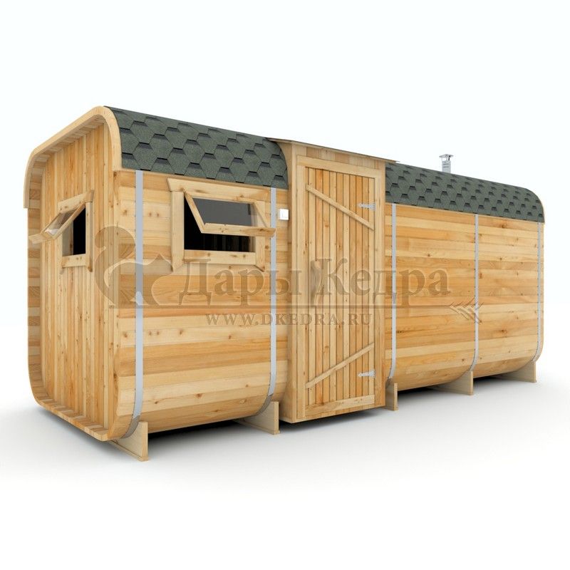 Баня-бочка квадро из кедра с верандой (все размеры) Это прямоугольное с закругленными углами. За счет такой конструкции во время топки воздух циркулирует по кругу, поэтому баня-бочка нагревается не более 30 минут. На веранде можно оставить вещи или отдохнуть после процедур парения. Лавочки из кедра находятся по всей длине бани-бочки с обеих сторон. Печь расположена в парилке около дальней стены. В зависимости от выбранного размера баня-бочка квадро с верандой имеет следующую комплектацию: Баня-бочка квадро 2,5 метра - парилка; Баня-бочка квадро 3,5 и 4,5 метра - раздевалка, парилка; Баня-бочка квадро 5,5 и 6 метров - раздевалка, парилка, моечная. По вашему желанию ее можно укомплектовать печью с внешней загрузкой, благодаря которой весь мусор вовремя топки остается на улице. Баня-бочка квадро не требует полноценный фундамент, поэтому при необходимости ее можно перенести в другое место. Обращаем Ваше внимание, что в стандартную комплектацию бани входят лавки в парной с обеих сторон. Дополнительно можно заказать полок открытого или закрытого типа! Кедр обладает ароматическими свойствами. Он не деформируется и влагоустойчив, при правильном уходе за деревом на нем не развиваются грибки и плесень. Обращаем Ваше внимание, что данную модель бани-бочки можно изготовить с ровным полом. Эта дополнительная опция и оплачивается отдельно!