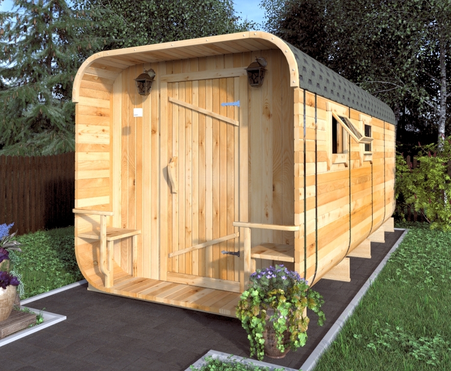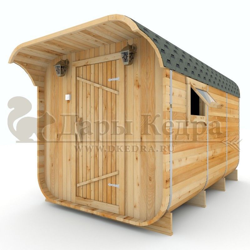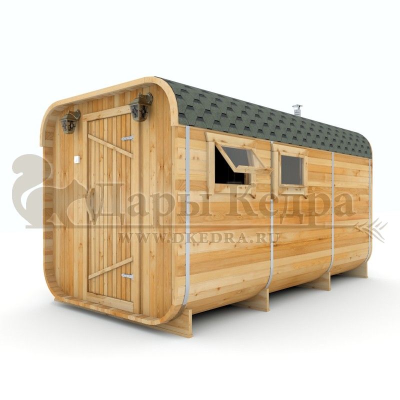 Баня-бочка квадро из кедра с козырьком (все размеры) Это прямоугольное изделие с закругленными углами. За счет такой конструкции во время топки воздух циркулирует по кругу, поэтому баня-бочка нагревается не более 30 минут. Козырек не только украшает баню, но и защищает оставленную обувь от дождя. Лавочки из кедра находятся по всей длине бани-бочки с обеих сторон. Печь расположена в парилке около дальней стены. В зависимости от выбранного размера баня-бочка квадро с козырьком имеет следующую комплектацию: Баня-бочка квадро 2,5 метра - парилка; Баня-бочка квадро 3,5 и 4,5 метра - раздевалка, парилка; Баня-бочка квадро 5,5 метров - раздевалка, парилка, моечная. По вашему желанию ее можно укомплектовать печью с внешней загрузкой, благодаря которой весь мусор вовремя топки остается на улице. Баня-бочка квадро не требует полноценный фундамент, поэтому при необходимости ее можно перенести в другое место. Обращаем Ваше внимание, что в стандартную комплектацию бани входят лавки в парной с обеих сторон. Дополнительно можно заказать полок открытого или закрытого типа! Кедр обладает ароматическими свойствами. Он не деформируется и влагоустойчив, при правильном уходе за деревом на нем не развиваются грибки и плесень. Обращаем Ваше внимание, что данную модель бани-бочки можно изготовить с ровным полом. Эта дополнительная опция и оплачивается отдельно!