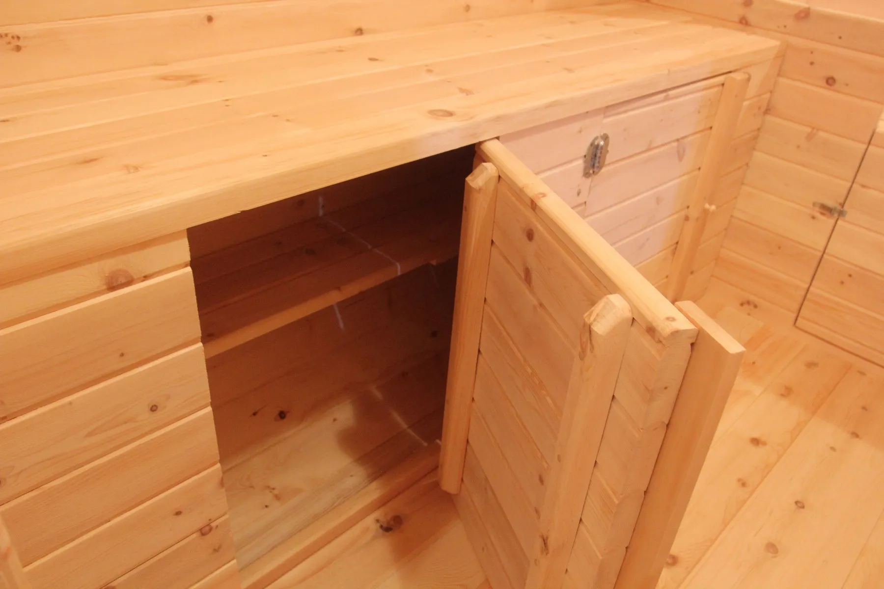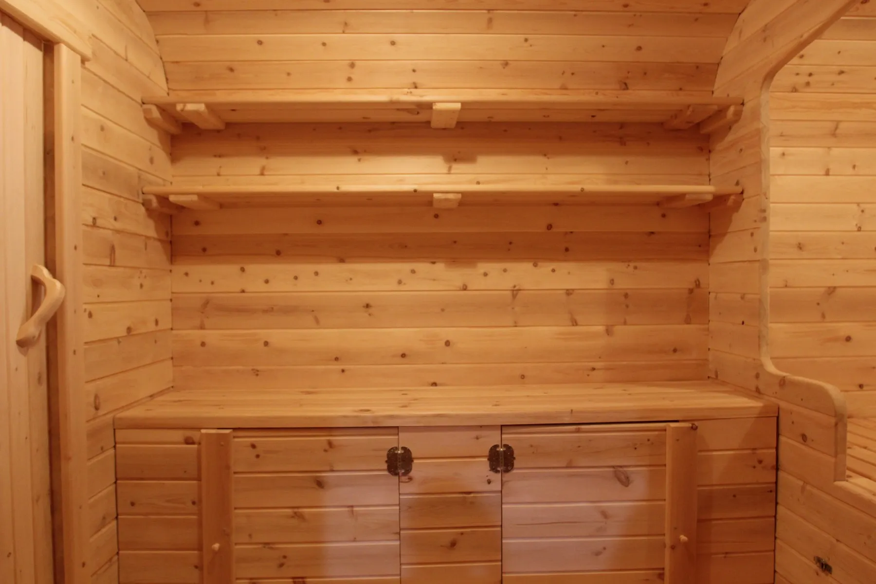 Баня-буханка более просторная за счет увеличенной высоты потолков и ровного пола. Козырек не только украшает баню, но и защищает оставленную обувь от дождя. Лавочки из кедра находятся по всей длине бани-бочки с обеих сторон. Печь расположена в парилке около дальней стены. Время растопки такой бани не превышает 30 минут. В зависимости от выбранного размера баня-бочка буханка с козырьком имеет следующую комплектацию: