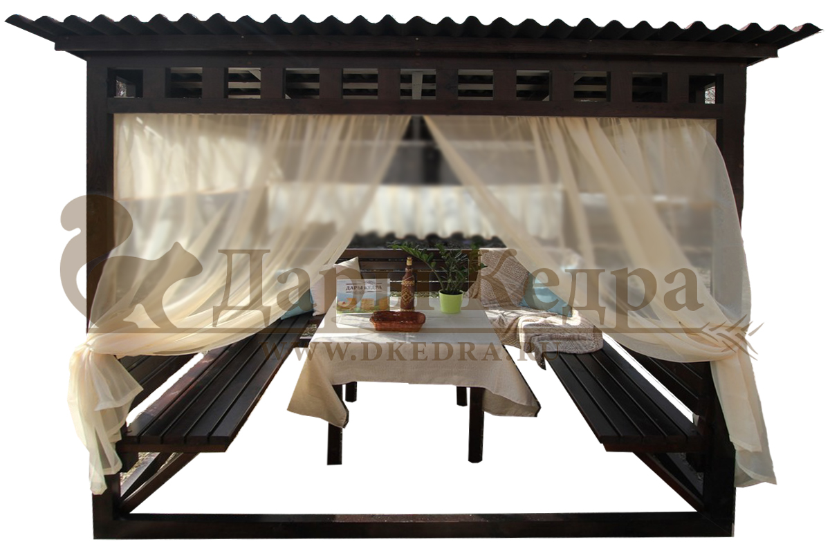 Беседка выполнена из кедра. На крыше - ондулин. Конструкция отличается простотой в установке, легкостью, долговечностью, прочностью и классическим дизайном, который впишется в любой интерьер приусадебного участка. Вокруг неё можно организовать ландшафт из вьющихся растений, которые красиво создадут зеленые "стены" снаружи и уют внутри.