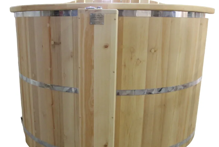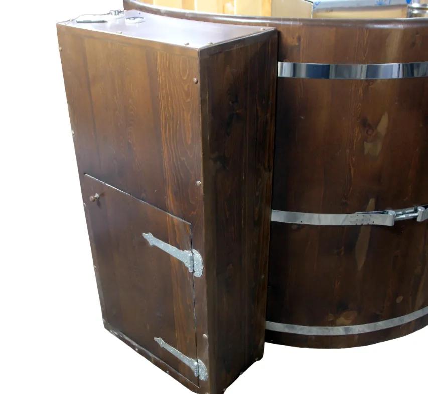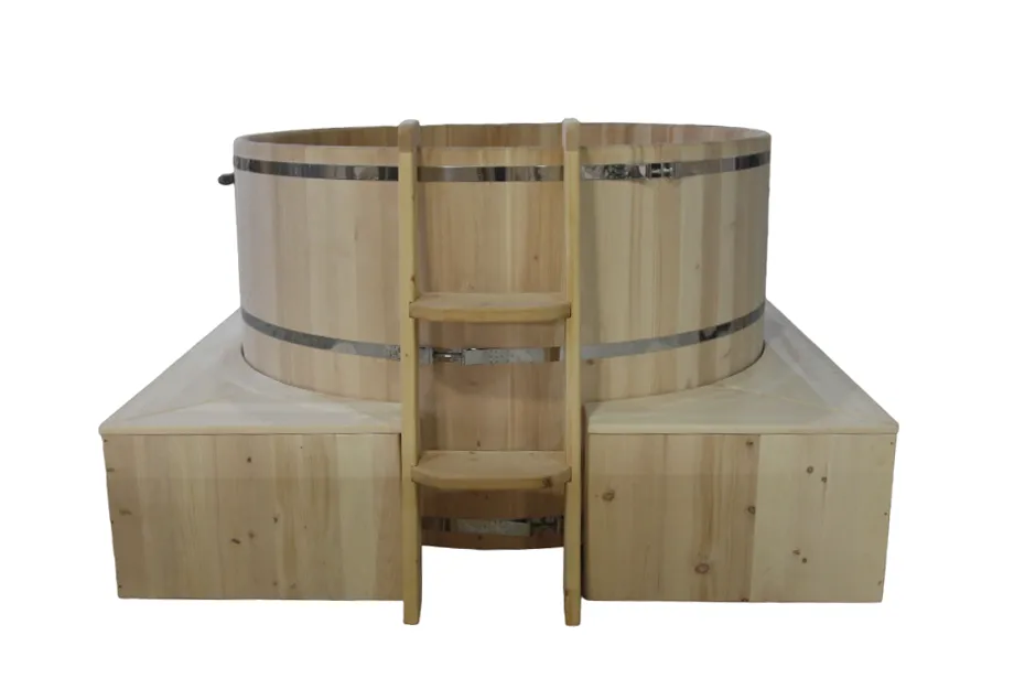 Двойная купель из кедра чаще всего используется в крупных банных комплексах и оздоровительных центрах. Она представляет собой две круглые чаши для воды, в которых люди отдыхают после парения. Между купелями установлен широкий подиум из кедра, по которому могут спускаться и подниматься сразу несколько людей. Для комфортного отдыха купель оснащена лавочками и двумя дополнительными лестницами. За счет стяжных болтов обручи из нержавеющей стали плотно прилегают к кедровой купели. Это позволяет равномерно распределять нагрузку воды и сохранить форму изделия в период эксплуатации. При правильном уходе купель для бани не рассыхается и не подвергается гниению.