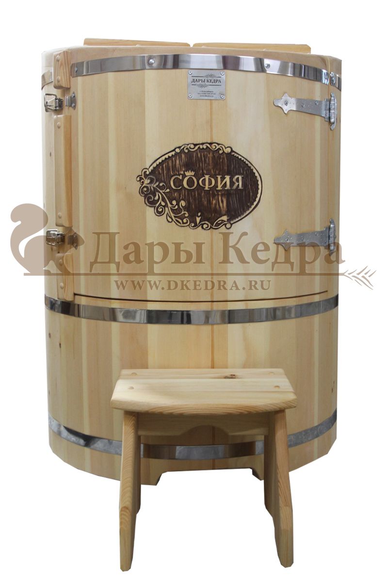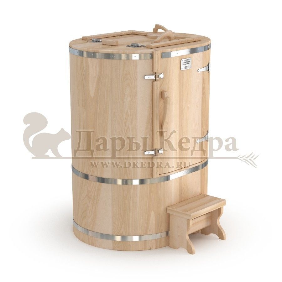 Готовый комплект «Универсальный»: кедровая бочка с парогенератором + био-защита изнутри и снаружи Готовый комплект - это полностью укомплектованный набор с фитобочкой для процедур парения. Овальная модель более просторна и удобна в использовании. Толщина стенок составляет 40-45 мм, что позволяет увеличить срок службы изделия. Верхний скос делает положение головы более комфортным и улучшает обзор. Фитобочка оборудована откидными створками, дверцей и отверстием для головы. Во время парения человек сидит внутри кедровой бочки, а голова находится снаружи. Благодаря этому исключается возможность перегрева. Подлокотники из кедра, встроенные ручки на створках и двери делают эксплуатацию более удобной. Парение в фитобочке благотворно влияет на организм в целом: повышается иммунитет, выводятся шлаки и токсины, улучшается работа органов тела и состояние кожи.